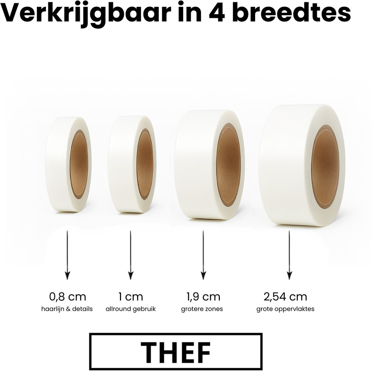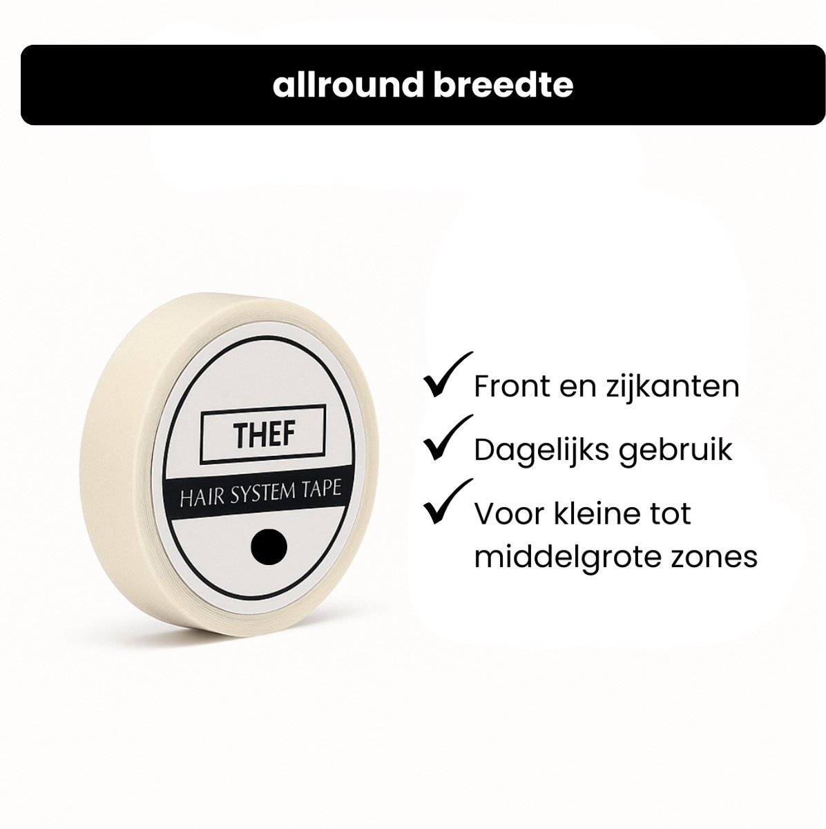 De tape is verkrijgbaar in meerdere breedtes: 0,8 cm, 1,0 cm, 1,9 cm en 2,5 cm. De smallere breedtes zijn ideaal voor precieze randen en details, terwijl de bredere maten extra stabiliteit geven bij grotere oppervlaktes van pruiken of haarwerksystemen. Dankzij de krachtige lijmlaag en dikkere drager is dit een echte wig tape voor wie geen compromis wil sluiten op grip.