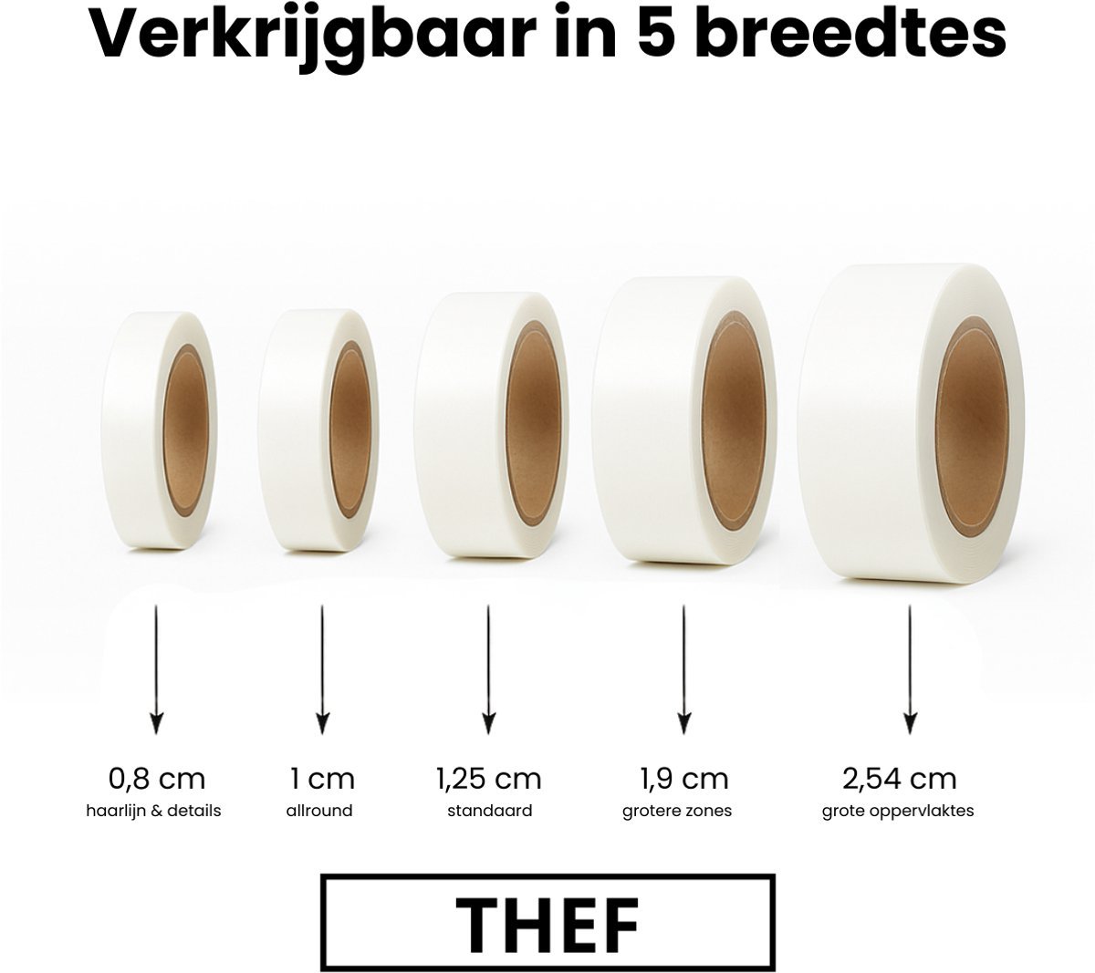 Deze tape is verkrijgbaar in meerdere breedtes: 0,8 cm, 1,0 cm, 1,25 cm, 1,9 cm en 2,5 cm. Smalle breedtes zijn perfect voor precieze randen en haarlijnen, terwijl de bredere varianten extra steun bieden op grotere contactvlakken. Zo is deze tape veelzijdig inzetbaar als wig tape, haar tape en hair tape voor allerlei soorten haarwerken en pruiken.