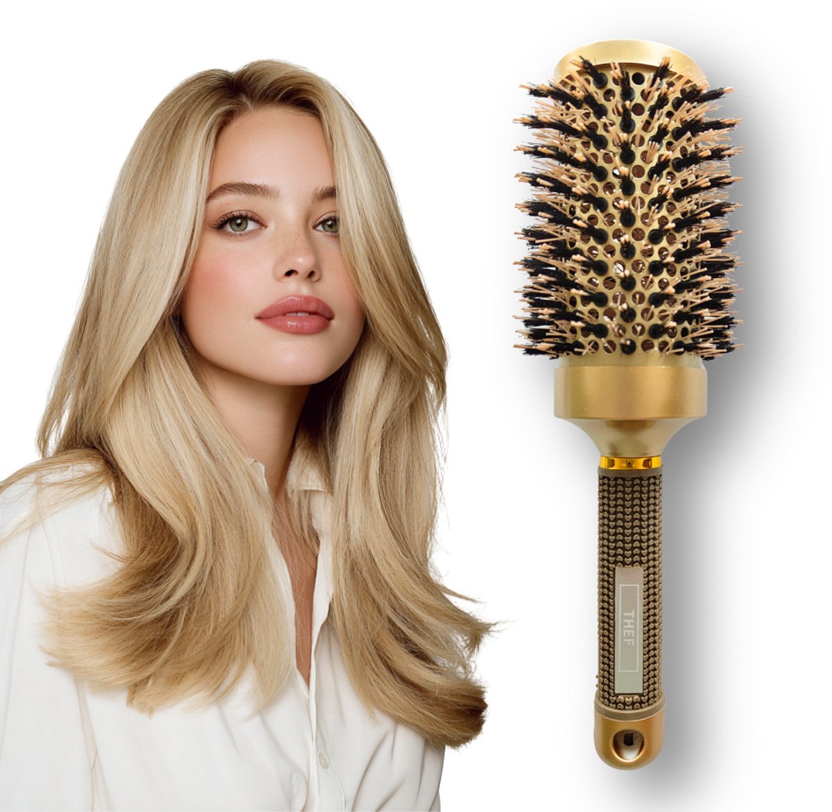 De goudkleurige afwerking met subtiele THEF-branding maakt deze föhnborstel een stijlvolle keuze voor dagelijks gebruik.