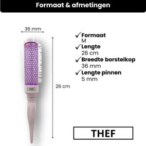 De THEF professionele föhnborstel is een ronde stylingborstel met keramische coating, ontworpen voor het creëren van volume, gladheid en een natuurlijke slag. Deze paarse variant combineert functionaliteit met een stijlvolle uitstraling en is geschikt voor zowel salon- als thuisgebruik.