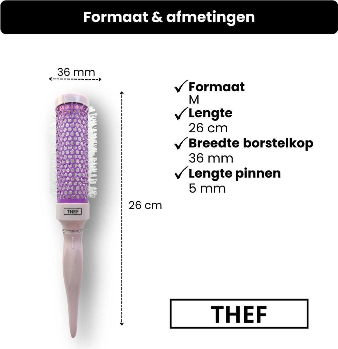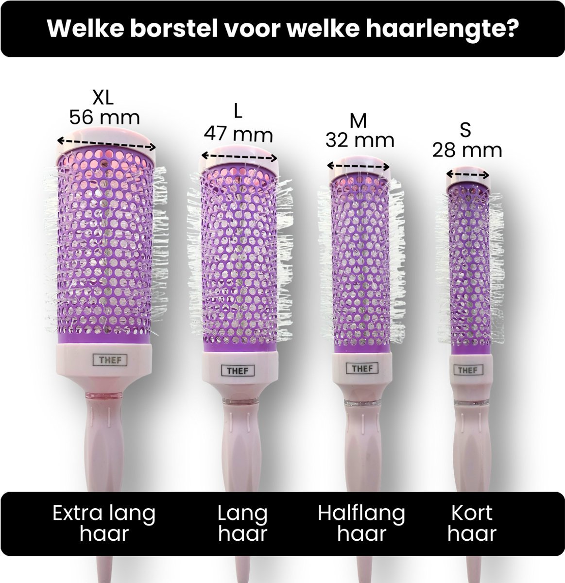 De THEF föhnborstel is verkrijgbaar in maat S, M, L en XL.