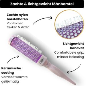 Deze keramische föhnborstel is ontworpen voor snel drogen, meer volume en een glad resultaat zonder pluis.